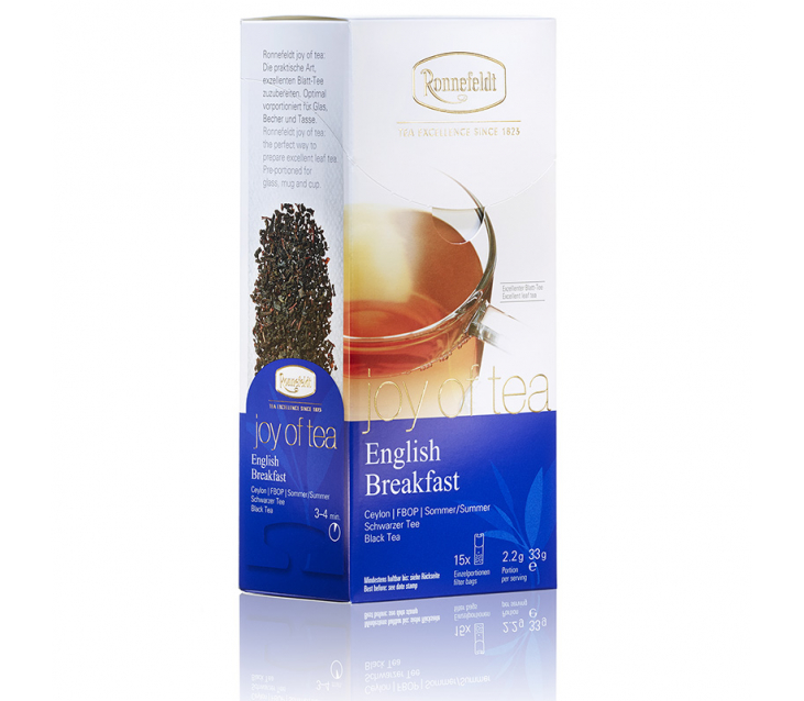 Чорний чай Ronnefeldt English Breakfast Joy of Tea (Роннефельдт Англійський Сніданок) в саше на чашку – ідеальний бленд з кращих сортів чаю з високогірної плантації Ува. Напій відрізняється міцним та насиченим смаком, пряними та солодовими відтінками. У його глибокому ароматі представлені квіткові тони та нотки цитрусу. Купаж добре відомий своїми тонізуючими властивостями. Прекрасно поєднується з цукром, лимоном чи молоком.