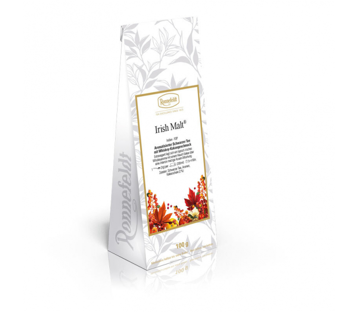 Чай чорний Ronnefeldt Irish Malt – ароматизований чорний чай зі смаком віскі та какао. Типовий ірландський аромат віскі з відтінком какао екстравагантно накладається на інтенсивну солодову суміш Ассам.