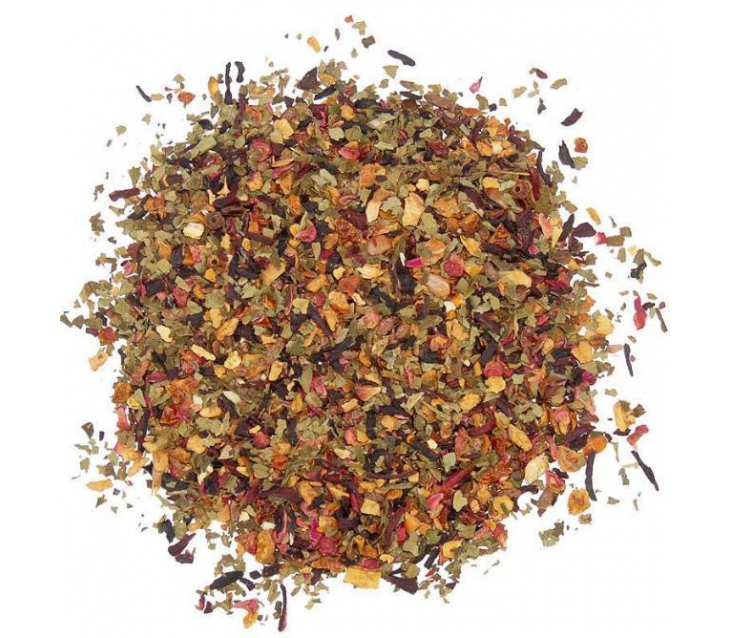 Склад: гібіскус, шматочки яблука, шкірка шипшини, листя солодкої ожини, ароматизатори, малина (5%), цедра апельсина, пелюстки троянд.
