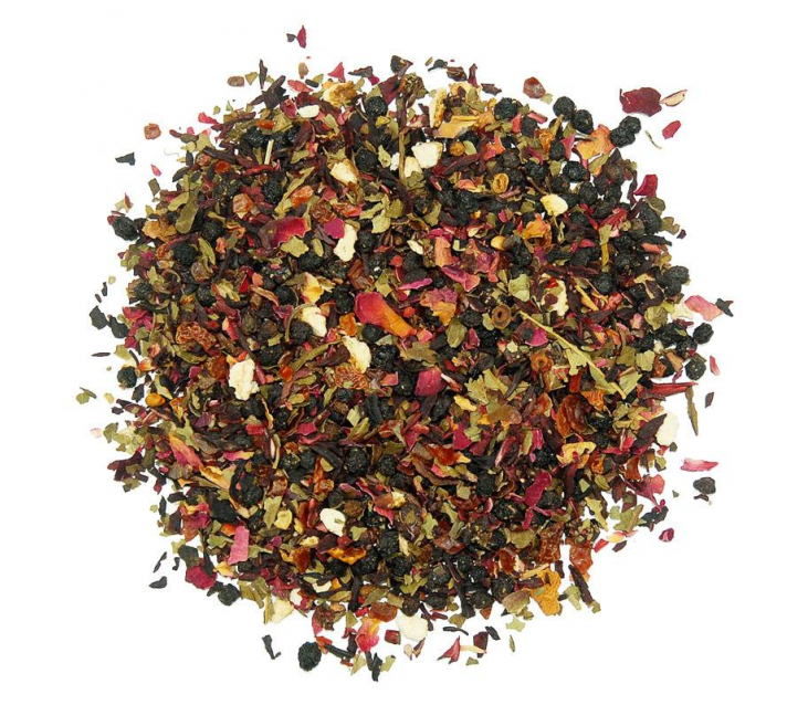 Склад: гібіскус, бузина, шкірка шипшини, листя солодкої ожини, ароматизатор, квітки троянди, шматочки вишні (3%), цедра апельсина