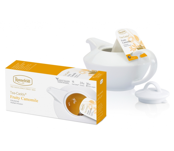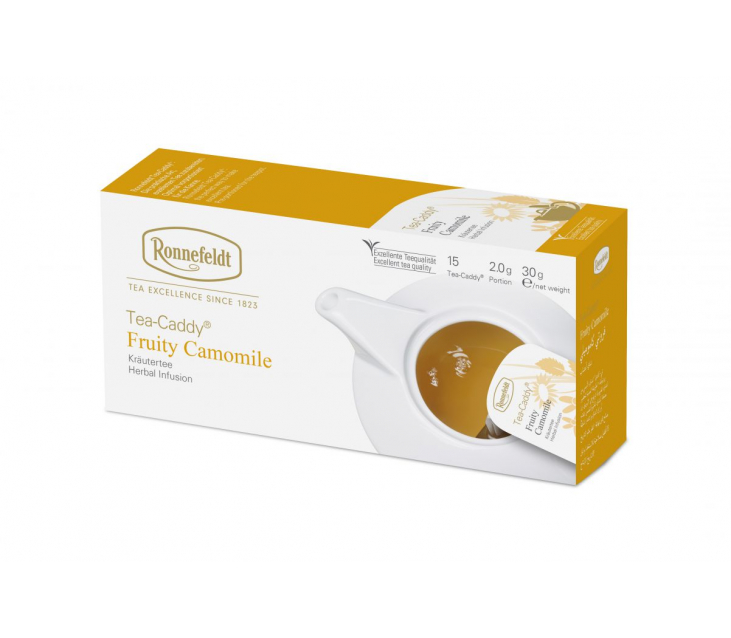 Чай Ronnefeldt Fruity Camomile TeaCaddy® (Роннефельдт Фруктова Ромашка) – лікувальний та заспокійливий трав'яний чай на основі квіток ромашки з ніжною солодкістю апельсинових пелюсток.