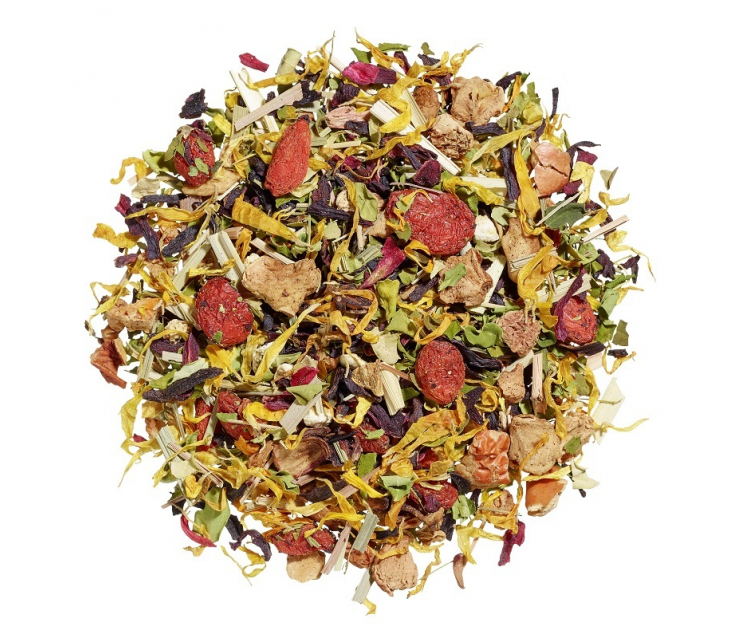 Склад: гібіскус**, шматочки яблук**, ягоди годжі** (8%), листя морінги** (8%), лимонна трава**, цедра лимона**, листя стевії**, квіти календули**, лимонна олія**