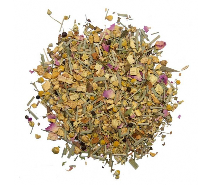 Склад: імбир, аніс, фенхель, лимонна трава, шматочки лакриці, кориця, ромашка, пелюстки троянди, листя ожини, лимонна вербена.
