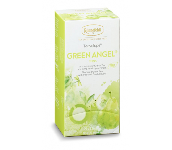 Органічний зелений чай Ronnefeldt Green Angel Teavelope (Роннефельдт Зелений Ангел), зібраний вручну на екологічно чистих плантаціях. Виробництво чаю відбувається без використання синтетичних добрив, пестицидів та інших хімікатів. Ґрунт збагачується виключно природним компостом, а також іншими «природними» добривами (рибними продуктами, перегноєм, молочною сироваткою тощо). Напівферментовані чайні листочки перед сушінням просочуються натуральними витяжками груші та персика. Настій з ніжним кольором, чудовим терпким смаком і солодкуватими нотками соковитих фруктів.